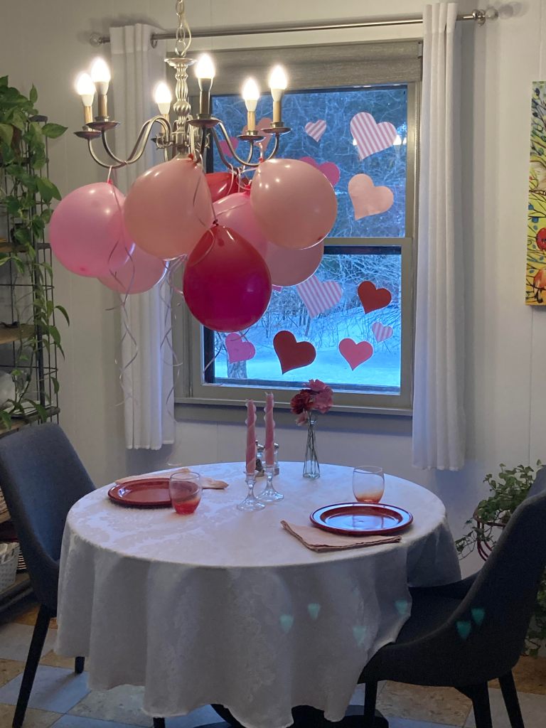It looks awful gray out there, but it’s actually brighter now that February is half over. Reached 30 degrees today, first time in a couple of weeks. Dee set up a gorgeous Valentine’s Day tea & cake which happened right as I got home. This photo is the dinner setup…I get to reheat the lasagne I made at Christmas.